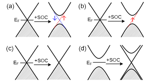 图1 (a)第一、(b)第二、(c)第三、(d)第四类二维狄拉克材料在考虑SOC作用后的能带结构变化示意图。