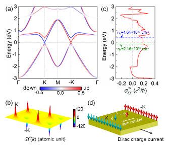 结合第一性原理计算及紧束缚近似模拟,该研究团队发现功能化的二维SbAs材料在适中的应变作用下为自旋谷耦合狄拉克半金属,如2.3%拉伸应变下的二维SbAsH2 (见图2)。研究结果表明: 自旋谷耦合狄拉克半金属中不等价能谷上的狄拉克费米子具有垂直于二维平面的反向自旋和相反的贝里曲率,如图3a和3b所示。因此,自旋谷耦合狄拉克半金属在平面内电场作用下将产生全新的“狄拉克自旋谷霍尔效应”(见图3d)——电场作用下,谷相反的贝里曲率将诱发两个相反的反常速度,使得两个不等价能谷K与-K中的具有相反自旋的载流子流向相反的横向边缘,并产生常数自旋霍尔电导(见图3c)。受时间反演对称性的保护,横向的自旋流为无耗散传输,而系统中的电荷载流子为无质量的狄拉克费米子。因此,在自旋谷耦合狄拉克半金属中可以同时实现无质量、无耗散的量子传输,这对下一代超高速、超低能耗电子器件的发展具有重要意义。