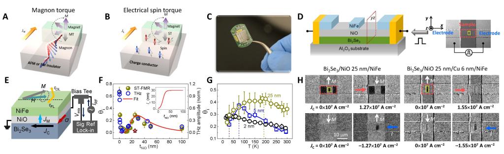 在前期工作基础上,他们设计了异质薄膜结构,反铁磁绝缘体NiO作为磁振子高效传输通道,拓扑绝缘体Bi2Se3作为高强度磁振子产生源,开创性利用磁振子转矩效应实现商业广泛应用的NiFe和CoFeB铁磁薄膜自旋磁矩180°翻转。器件在室温下运行,磁振子转矩效应显著,预期通过进一步调控器件,磁振子转矩强度有望进一步增强。