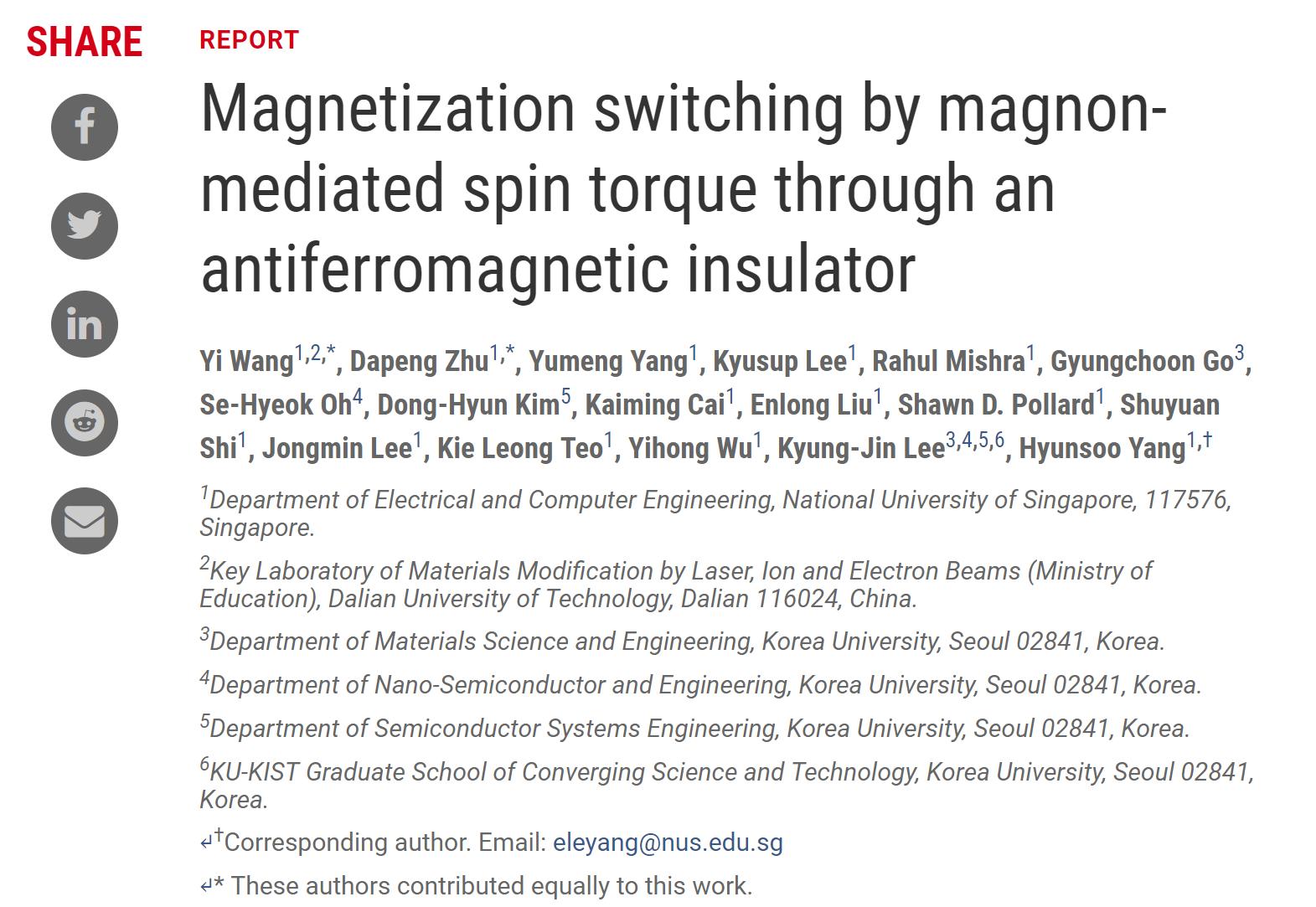 2019年11月29日,三束材料改性教育部重点实验室王译教授与新加坡国立大学Hyunsoo Yang教授,在世界顶级期刊Science (《科学》)上发表重要工作:利用自旋波翻转磁矩实现数据存储与逻辑运算。