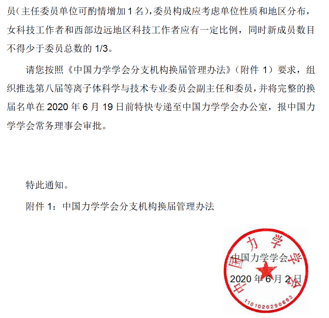 近期,我校物理学院宋远红教授当选为中国力学学会第十一届理事会理事,并通过中国力学学会第十一届理事会第二次理事长秘书长办公会审议,正式成为第八届等离子体科学与技术专业委员会主任委员,任期5年。