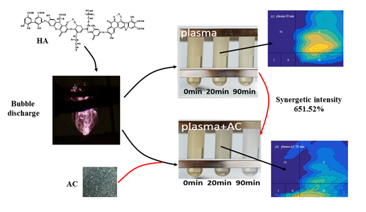 三束实验室高压放电等离子体研究团队长期致力于大气压低温等离子体源和应用技术研究,研究团队提出了脉冲激励气泡放电等离子体-活性炭联用技术高效去除水体中的腐植酸。该项技术中,高压脉冲放电过程中产生的高能电子e和•O、O3等氧化性物质能充分接触并改性活性炭,以产生较高的协同效率,从而增加其对腐植酸和O3、H2O2等活性粒子的吸附和降解;同时,该联用体系还能将O3、H2O2等活性粒子转化为高氧化还原电位的•OH (1.89-2.72 V),促进吸附在活性炭表面腐植酸的降解。该项技术中等离子体和活性炭在降解水体中有机物的协同效率高达651.52%,腐植酸去除效率接近100%,且活性炭表面吸附残留腐植酸量仅为4.52%。此外,还揭示了等离子体活化含活性炭水原位净化污染水源的能力。