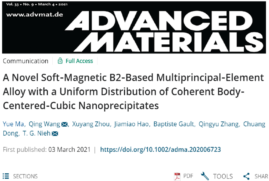 近日获悉,我室王清教授及团队成员在高性能高熵合金的软磁性能研究方面取得了突破性进展,实现了结构-功能一体化的材料设计,相关工作以‘A novel soft-magnetic B2-based multi-principal-element alloy with a uniform distribution of coherent body-centered-cubic nanoprecipitates’为题发表在材料科学领域顶尖期刊《Advanced Materials》上(IF=27.398)。