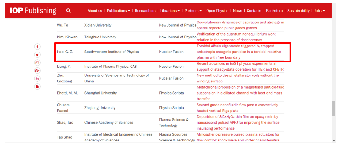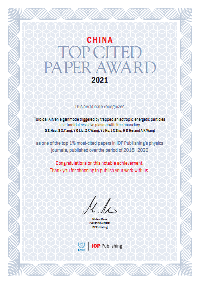 IOP出版社设已经连续四年设立“中国高被引文章奖”,旨在表彰来自中国最具影响力的研究成果。今年的“中国高被引文章奖”是从IOP旗下合作期刊2018—2020年的所有文章中选出的被引用前1%的文章。本次荣获“中国高被引文章奖”的《Nuclear Fusion》期刊文章共计三篇。