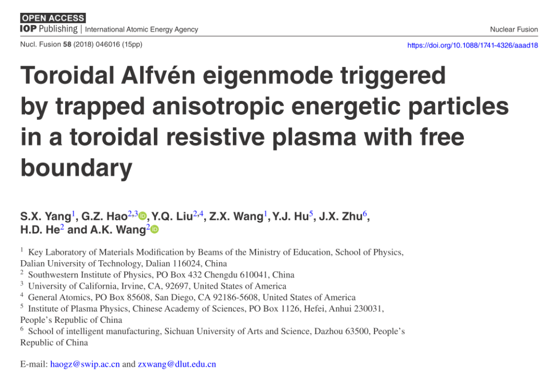 近日,由三束材料改性教育部重点实验室王正汹教授团队培养的杨三祥博士作为第一完成人,王正汹教授作为共同通讯作者,大连理工大学作为第一完成单位,发表于《Nuclear Fusion》期刊的“各向异性的捕获高能粒子在自由边界环形电阻等离子体中激发的环向阿尔芬本征模”文章,荣获 IOP出版社设立的“中国高被引文章奖”。该工作是与核工业西南物理研究院郝广周研究员、美国通用原子能公司刘钺强研究员、中科院合肥等离子体所胡友俊研究员等一起合作完成。