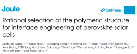 4月30日,相关成果以“Rational selection of the polymeric structure for interface engineering of perovskite solar cells”为题发表在Cell Press旗下的能源旗舰期刊Joule上,该研究给出了合理选择聚合物钝化剂的结构/官能团的指导方针,对未来开发新型高效聚合物钝化剂和钙钛矿太阳能电池商业化具有重要的指导意义。文章的第一作者是博士后王敏焕,合作导师边继明教授、以及美国加州大学洛杉矶分校YangYang教授,韩国成均馆大学J.W. Lee教授和大连化物所金盛烨研究员为通讯作者。