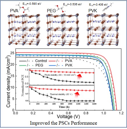 本研究通过选择三种典型聚合物——聚醋酸乙烯酯(PVA)、聚乙二醇(PEG)和聚9-乙烯基咔唑(PVK)进行模拟和实验分析,研究聚合物钝化材料结构对钙钛矿太阳能电池的影响。模拟和实验分析结果表明,聚醋酸乙烯酯(PVA)具有空间位阻小、给电子能力强的官能团,能够有效钝化钙钛矿薄膜表面的带电缺陷并增强载流子扩散能力,最终能够有效钝化钙钛矿薄膜表面的带电缺陷并增强载流子扩散能力,使钙钛矿太阳能电池的效率达到了23.2%,同时钙钛矿太阳能电池的长期工作稳定性也得到了显著提升。