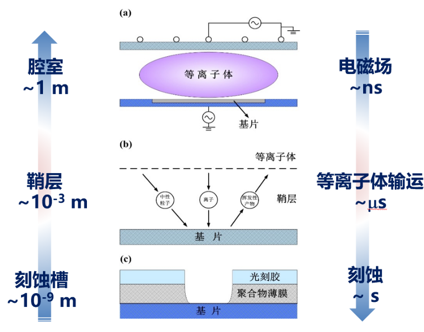 等离子体放电过程是极其复杂的,受到多种外界参数的控制,如电源功率与频率、气体成分与压强、腔室尺寸及材料属性等。此外,等离子体系统还包含了多空间尺度和多时间尺度的变化,以及多物理化学场的耦合过程。例如等离子体、鞘层、表面微槽等空间特征尺度相差10个量级;电磁场、带电粒子、中性气体及化学反应等时间特征尺度相差9个量级。如此复杂的等离子体工艺环境,给物理建模和数值仿真都带来了巨大挑战。
