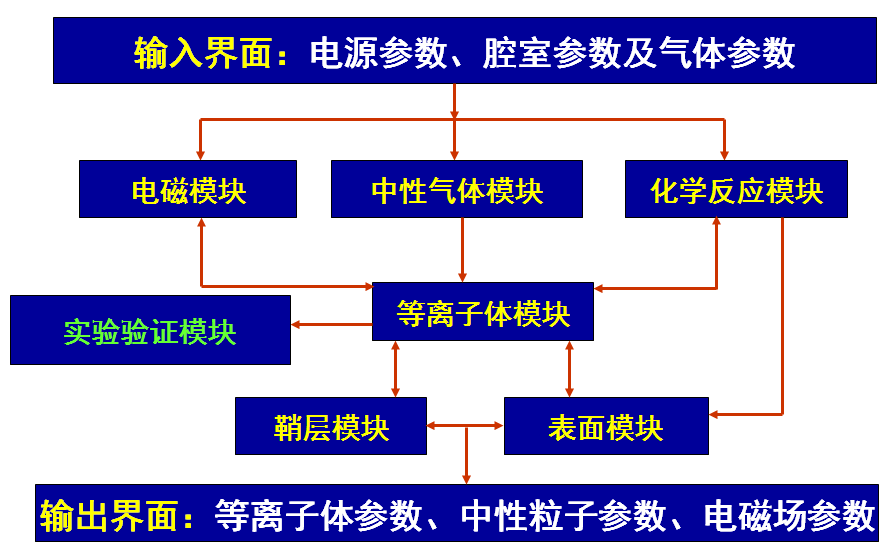 MAPS是一款专门面向等离子体工艺腔室的数值模拟软件平台,可以同时为等离子体工艺腔室的参数设计和表面处理工艺(材料刻蚀和薄膜沉积)的结果预测提供模拟服务。基于不同的等离子体模型,MAPS包含不同的数值模拟方法,如粒子/蒙特卡洛碰撞模拟方法、流体力学模拟方法、流体力学/蒙特卡洛碰撞混合模拟方法、整体模型模拟方法等。软件平台包含输入部分、输出部分以及七大模块,分别是等离子体模块、中性气体模块、电磁模块、鞘层模块、化学反应模块、表面模块及实验验证模块。