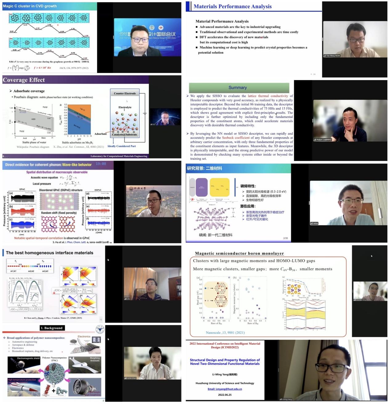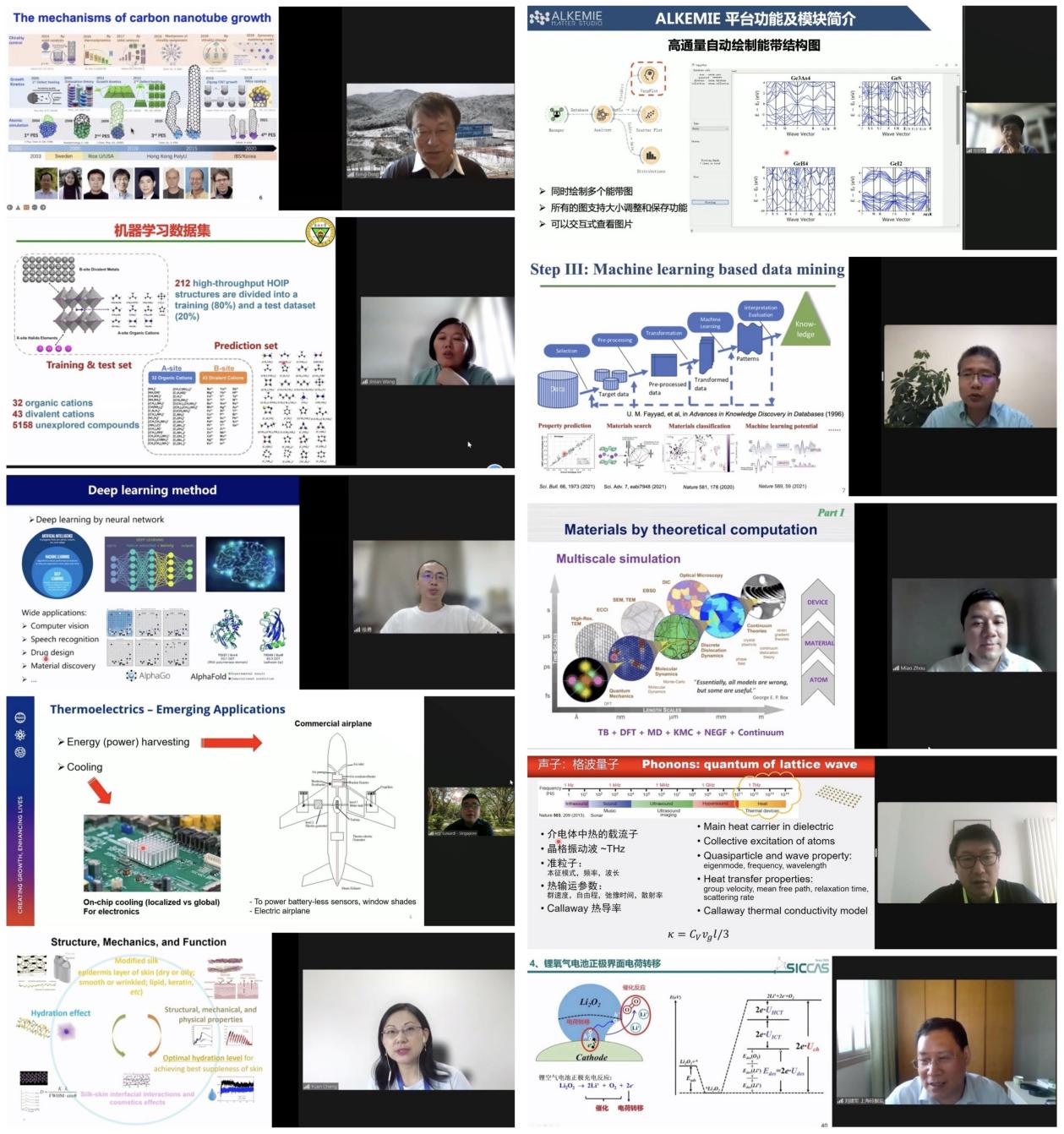 大连理工大学高峻峰、清华大学李佳、同济大学陈杰、南京师范大学张力发、浙江大学占海飞、北京航空航天大学王田、武汉大学刘惠军、澳门大学蔡永青、华南理工大学杨小宝、华中科技大学杨利明围绕新材料的结构搜索、重构与组装,新材料的电子性质、热学性质及其调控,新型热电材料的发展,拓扑绝缘体、超导体、铁磁体和铁电体的发展以及其它材料设计和理论模型分别作主题报告,深入地探讨理论模拟在理解材料行为,设计新材料方面中的重要作用。