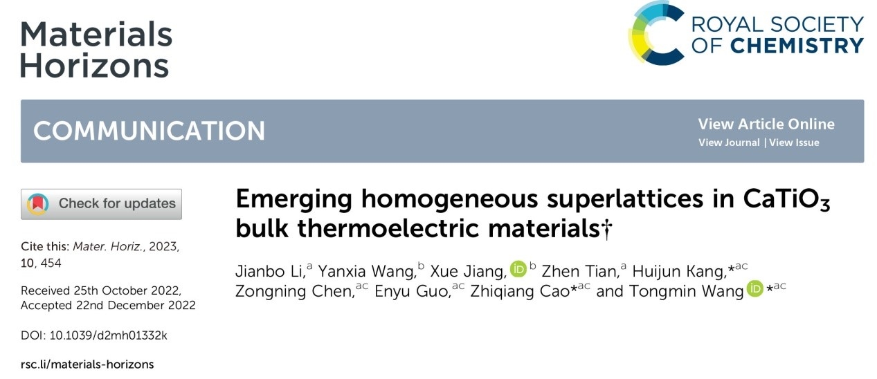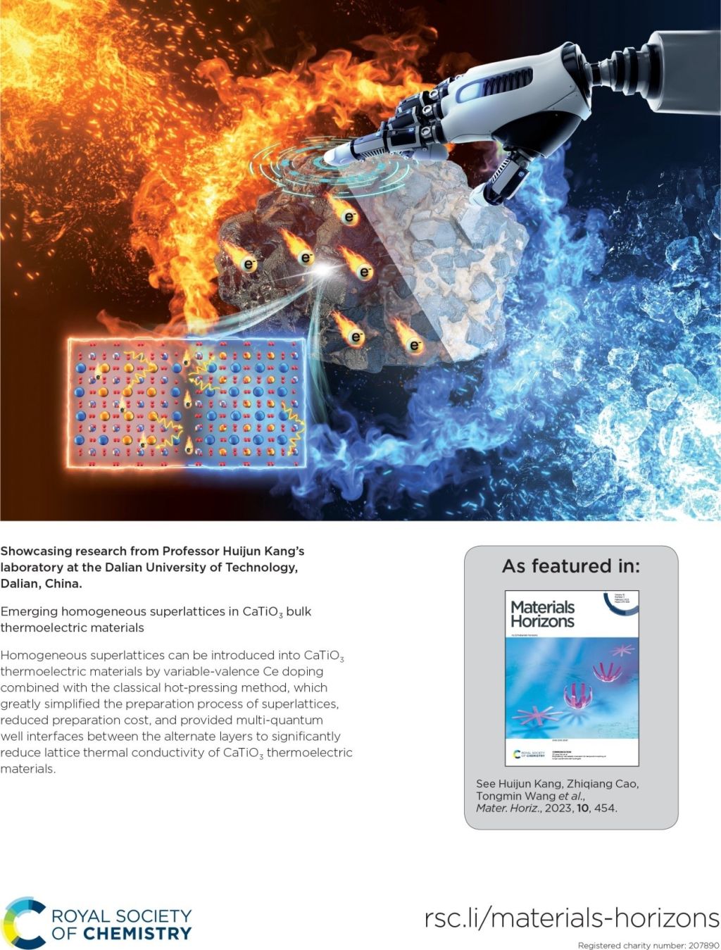 近日,王同敏与康慧君教授团队在英国皇家化学学会材料领域高水平学术期刊《Materials Horizons》在线发表了“Emerging Homogeneous Superlattices in CaTiO3Bulk Thermoelectric Materials”研究论文,并评选为“Back Cover”封面文章。