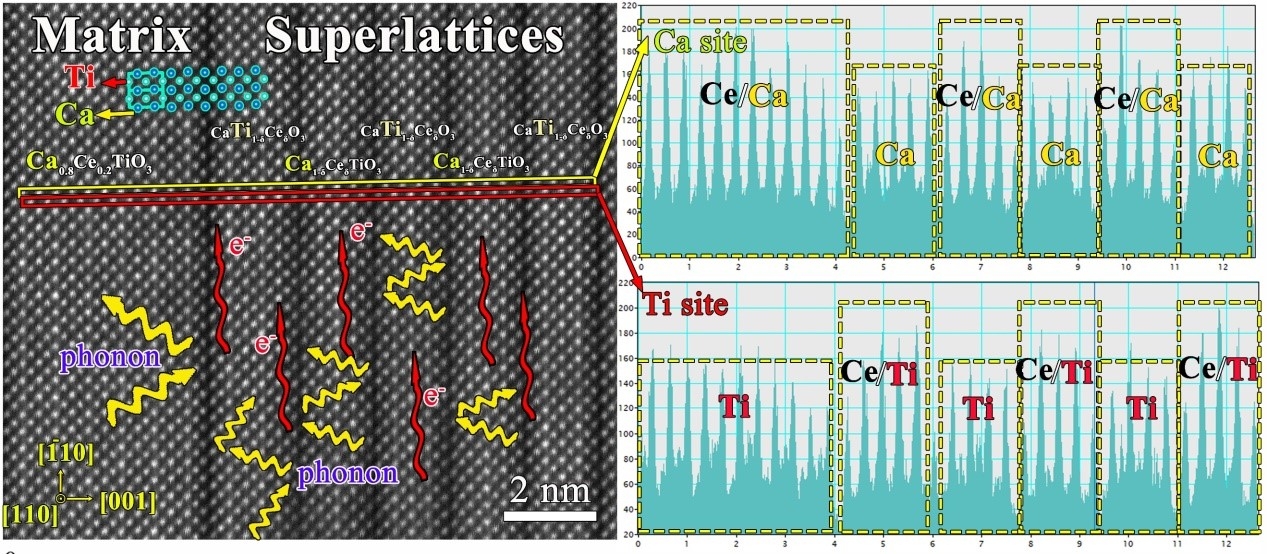 本研究是上述研究结果的进一步延伸和发展。CaTiO3材料的较高热导率是制约热电性能进一步提升的关键,王同敏和康慧君教授团队创造性地提出了一种新的设计思想,通过可变价Ce元素掺杂并结合微压烧结方法获得了由CeδCa1-δTiO3和CaTi1-δCeδO3交替层组成的均质超晶格,并在交替层之间提供了量子阱界面。由于界面处的声子散射和热边界电阻,超晶格的热导率比基体显著降低,获得了CaTiO3体系中最高的ZT值0.405(1031 K)。与分子外延技术、磁控溅射、激光沉积等方法相比,采用常规热压烧结方法在钙钛矿氧化物热电材料制备出大量的超晶格结构,大大降低了生产成本,该策略有望为热电材料中超晶格制备提供重要的理论依据。