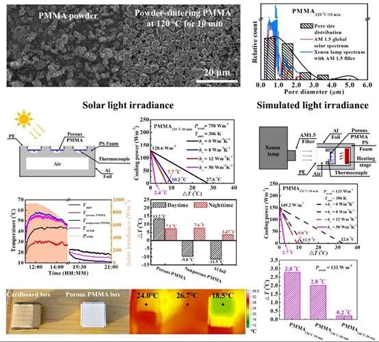 为了测试这种材料的性能,用PMMA多孔板制作封闭盒子,将其置于阳光下测量温度。由于平均能反射96%的红外和可见光,在室外26.7℃的条件下,PMMA多孔板制作的盒子内温度降至18.5℃。作为对比,相同尺寸的纸盒内温度仅降至24.0℃。随后,在实验室内重复了这项实验,用太阳模拟器控制风、温度等环境条件,发展了一种实验室辐射冷却研究的标准方法。